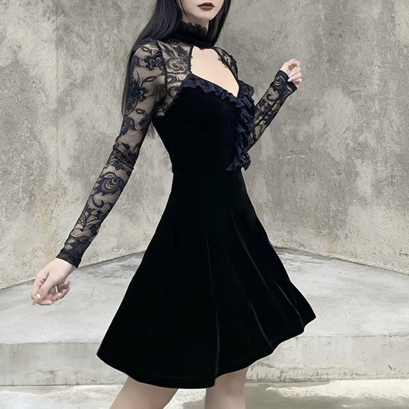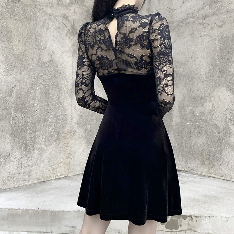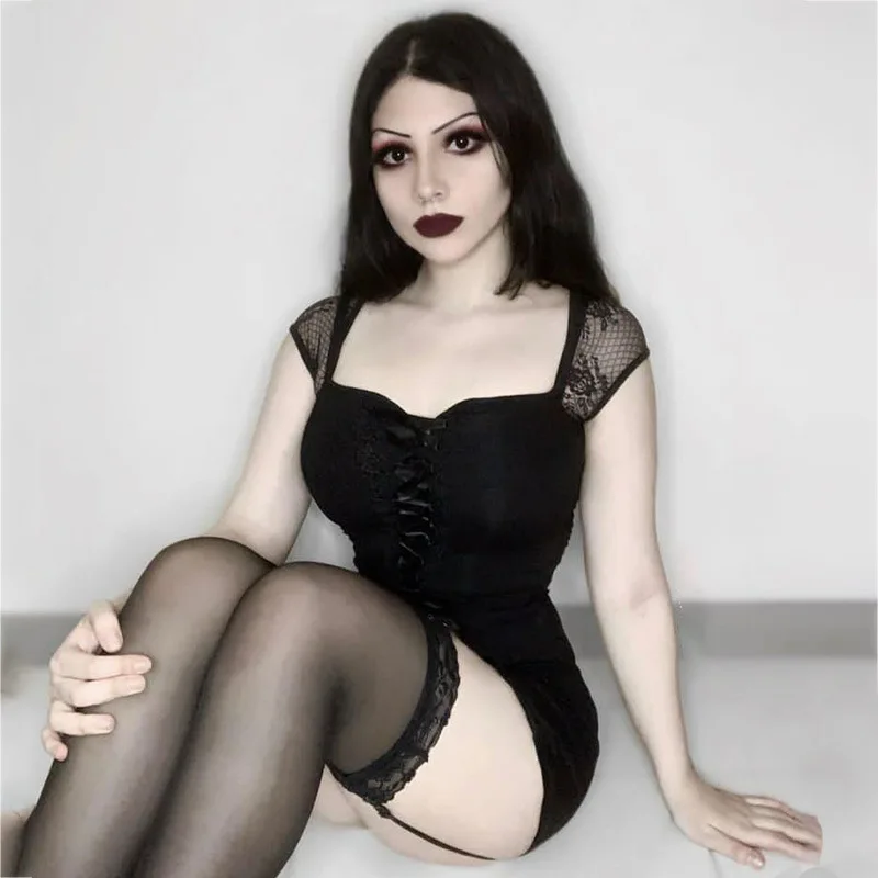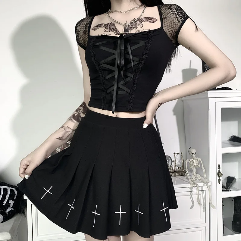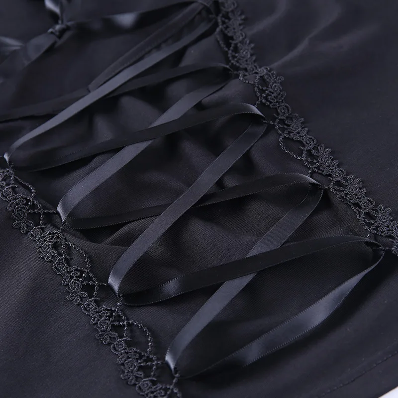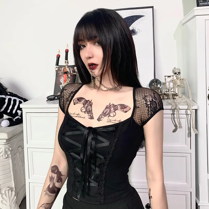 Vintage Tops Goth T-shirt Women Bodycon Bandage Lace Black T-shirts Gothic Streetwear Sexy Female Top Casual Mesh Tee