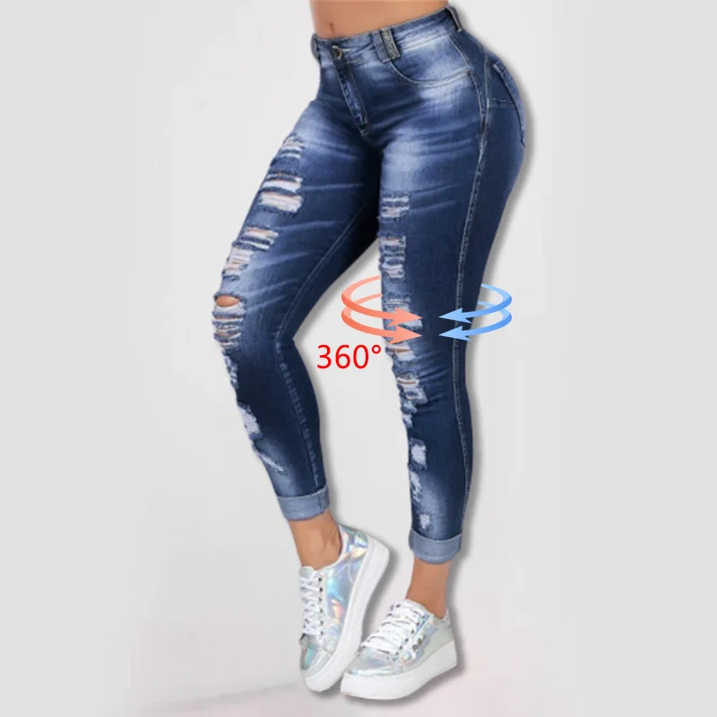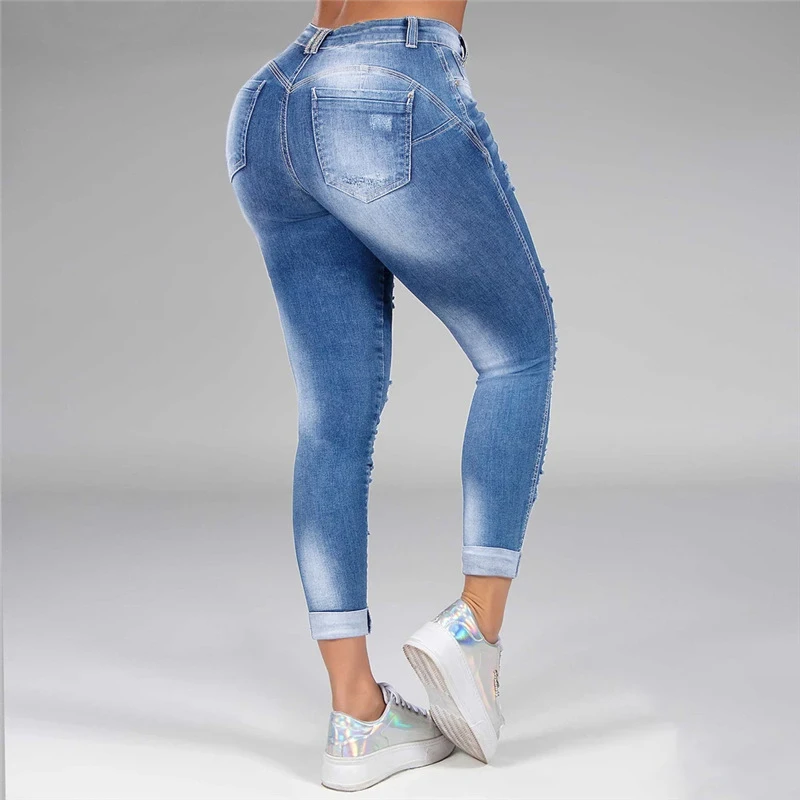 Washed Ripped Jeans Women Plus Size S-5XL Korean High Waist Trousers Skinny Denim Jeans Black Blue Hollow Bleached Pencil Pants