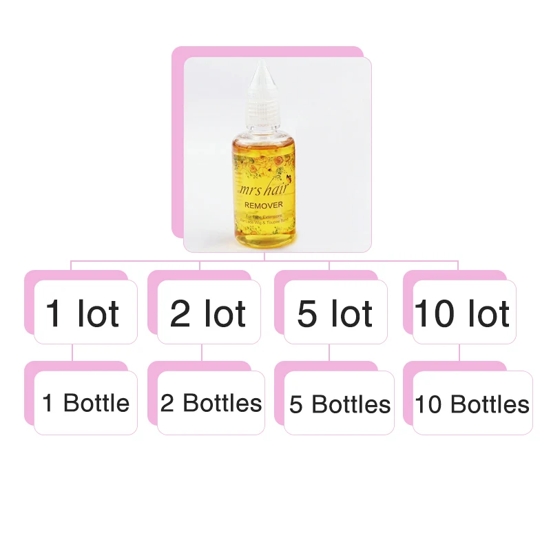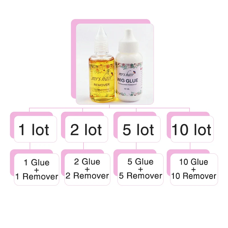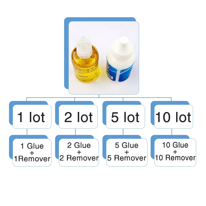 What's the meaning of 1lot, 2lot, 5lot…… When you choose glue , 1 lot mean 1 bottle glue when you choose glue and remover, 1 lot means 1 bottle glue and 1 bottle remover… when you choose glue and remover , 2 lots means 2 bottles glue and 2 bottles…