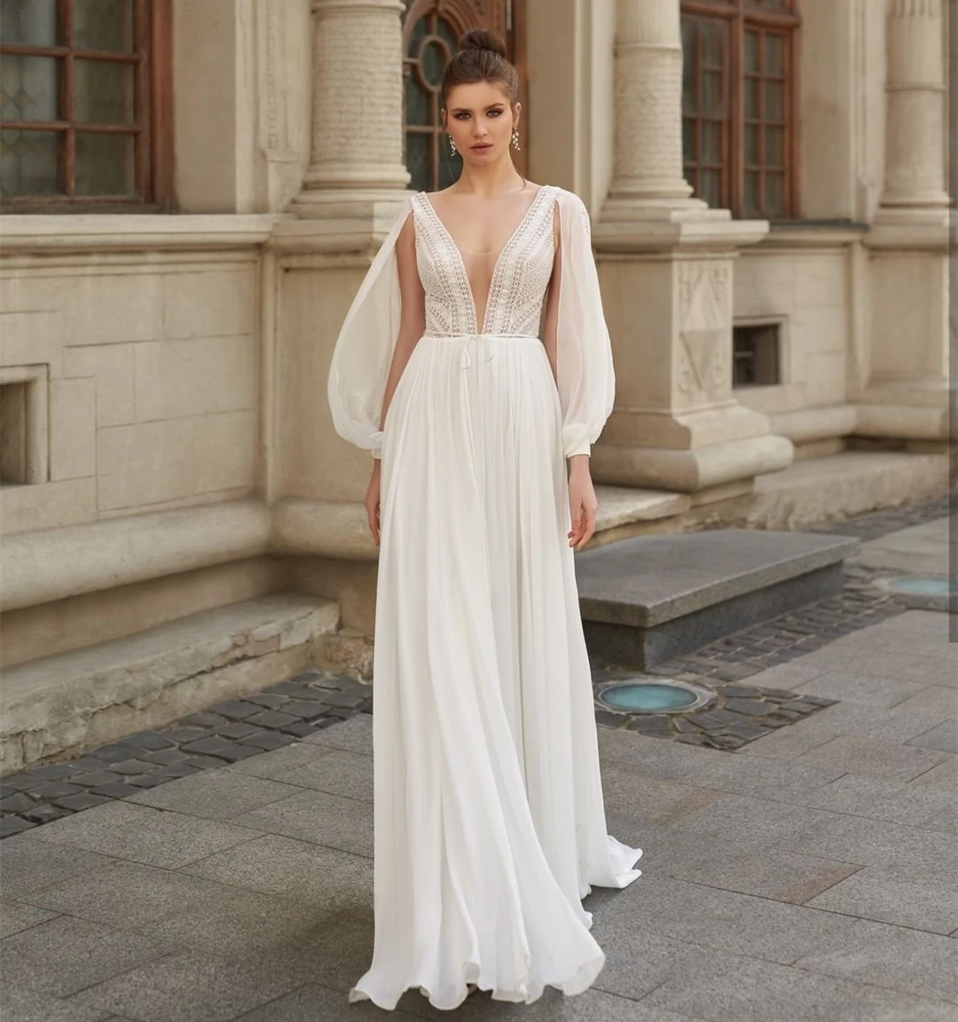 Wedding Dress 2020 Chiffon Off Shoulder Long Sleeve Floor Length Simple Beach Bridal Gown Low Back Cheap Women Brides Elegant