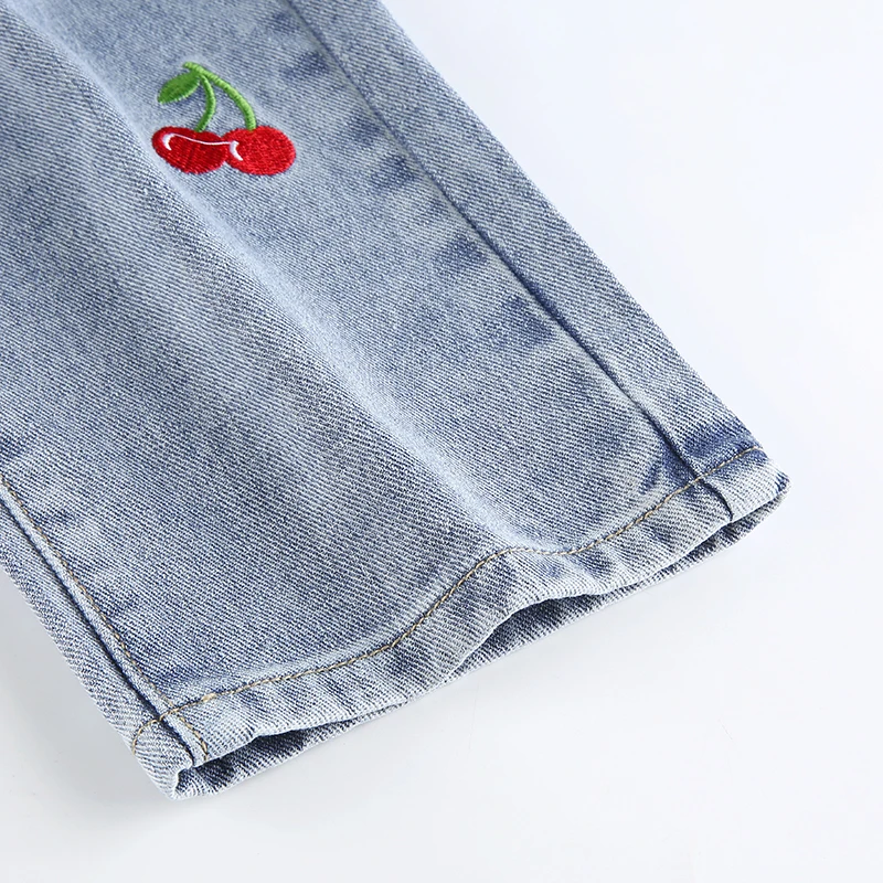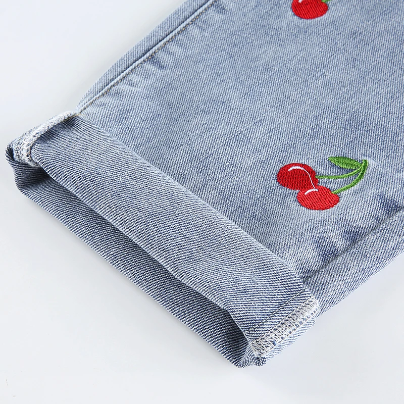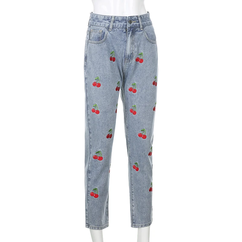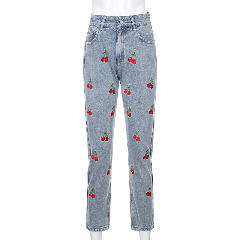Weekeep Cherry Embroidery Fashion Vintage Jeans 2020 Women High Waist Streetwear Cargo Jean Casual Slim Woman Denim Pencil Pants