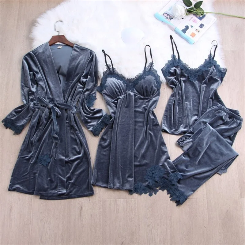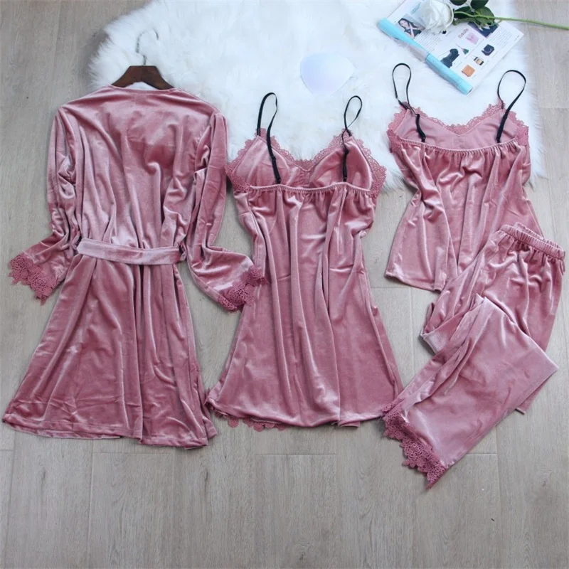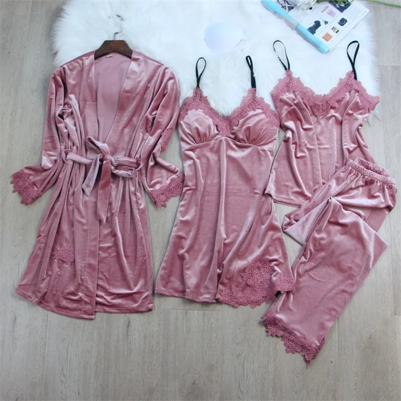 Winter Velvet Pajamas Set for Women Soft Keep Warm Sexy Sleepwear PJs 4PCs Full Sleeve Velour Nightgown Bath Robe Lingerie Suit