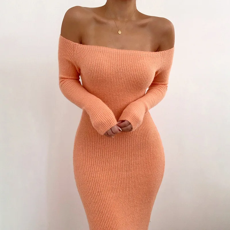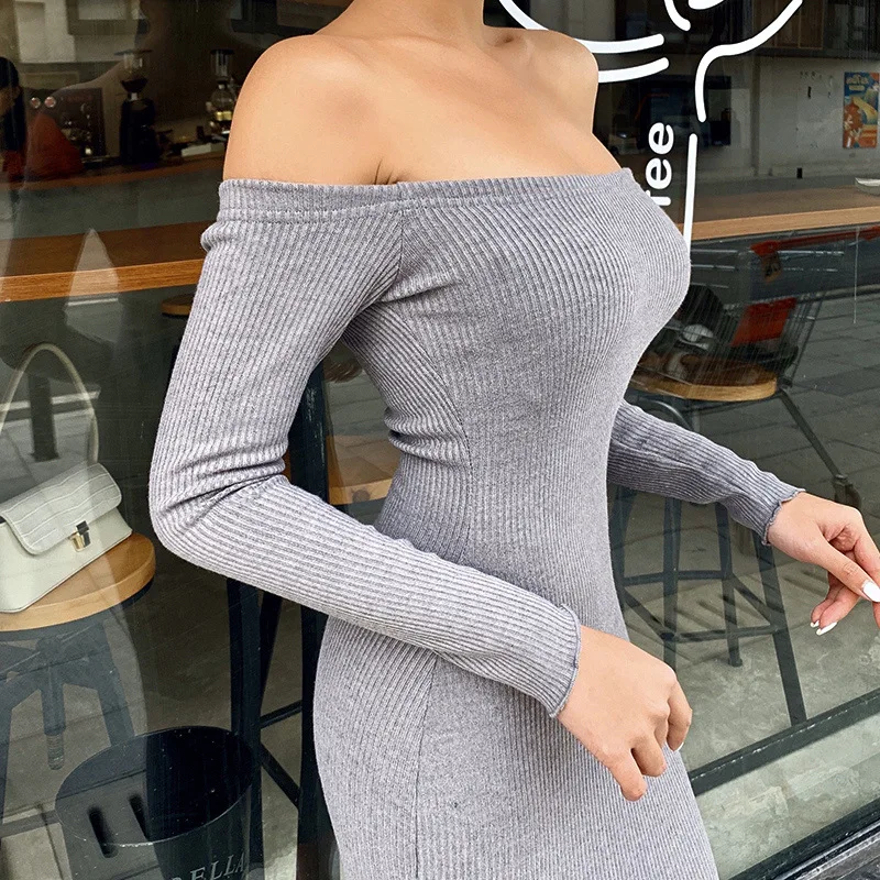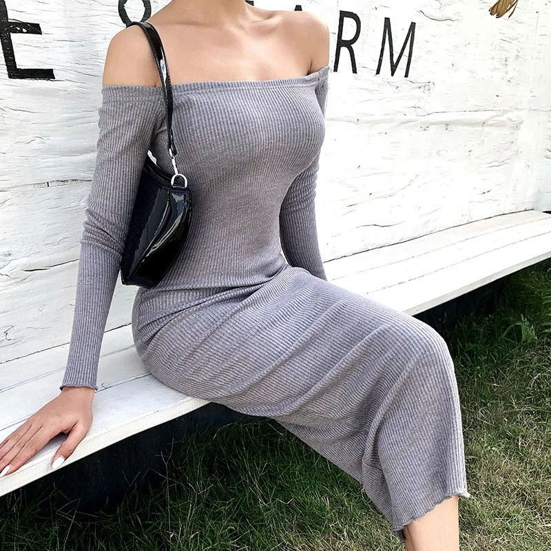 Women Autumn Dress Long Sleeve Cotton Ribbed Long Dresses Sexy Slash Neck Off Shoulder Midi Bodycon Dress Knitted Robe