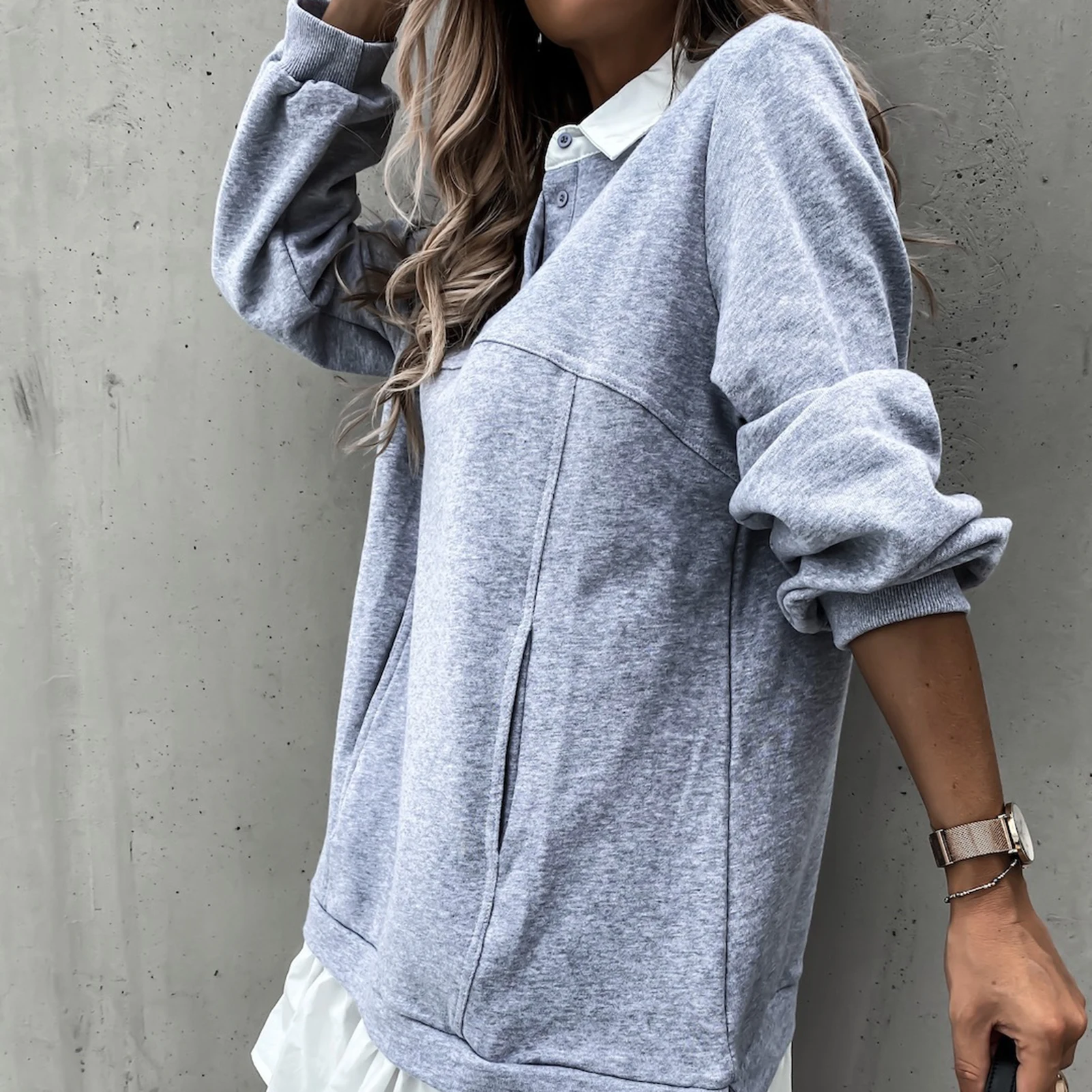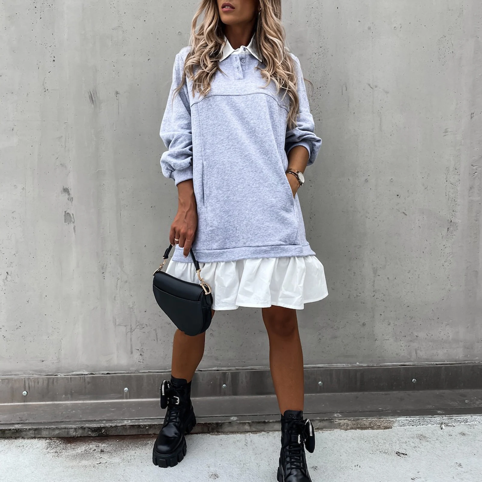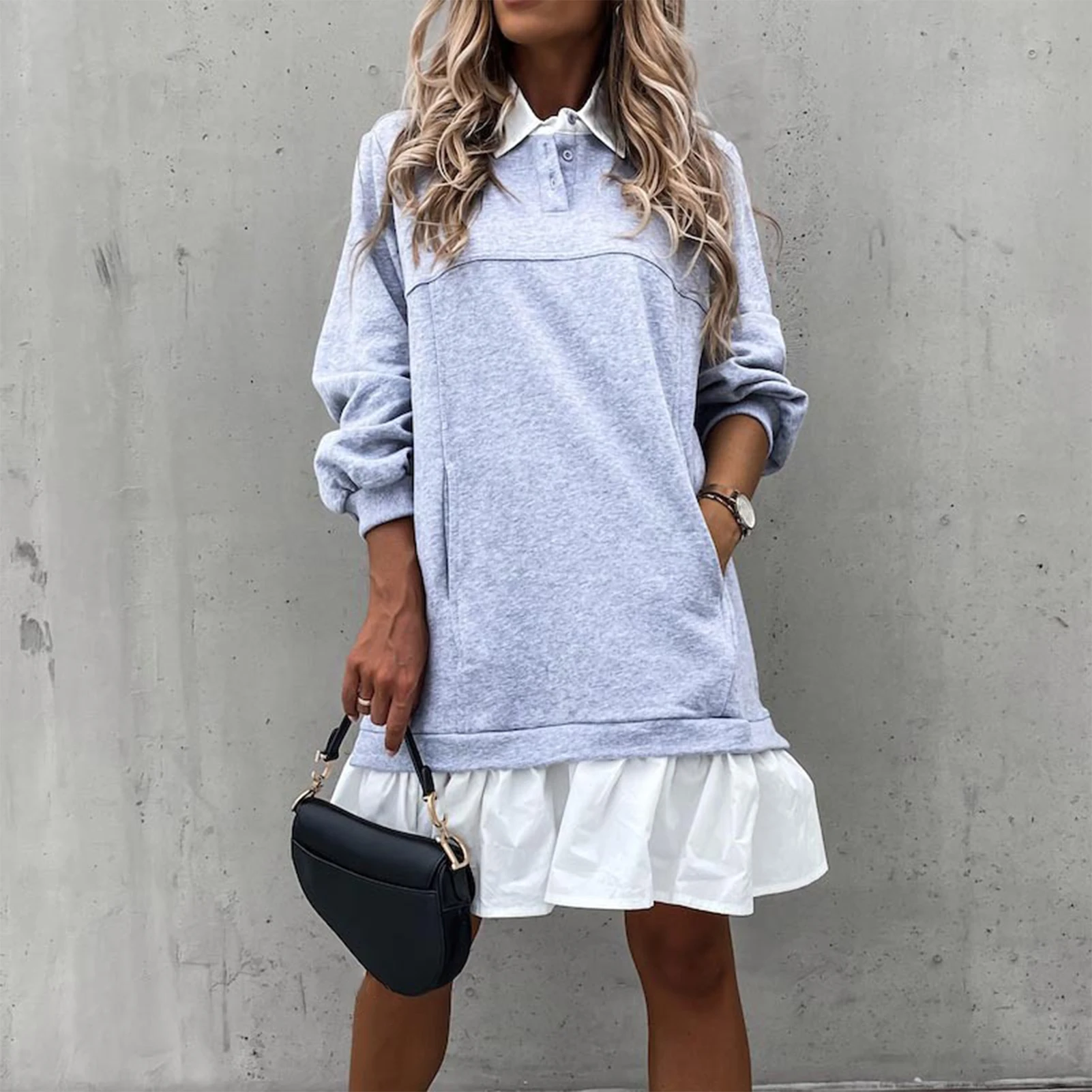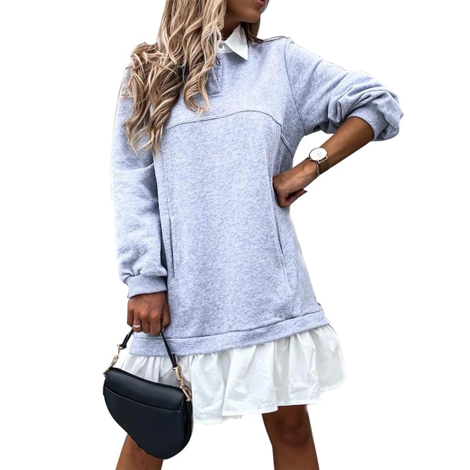 Women Autumn Turn-down Collar Long Sleeve Patchwork Buttons Sweatshirt Dress