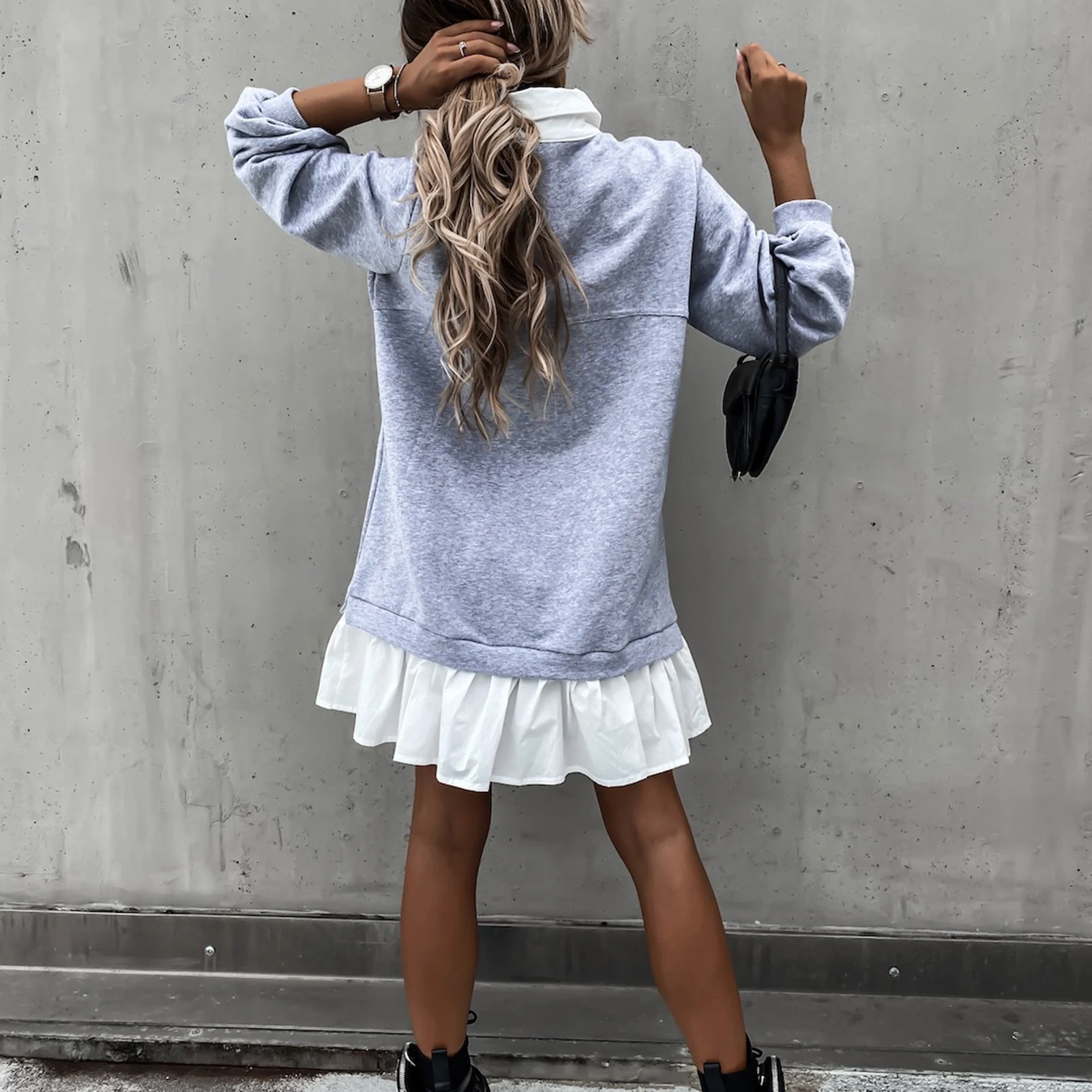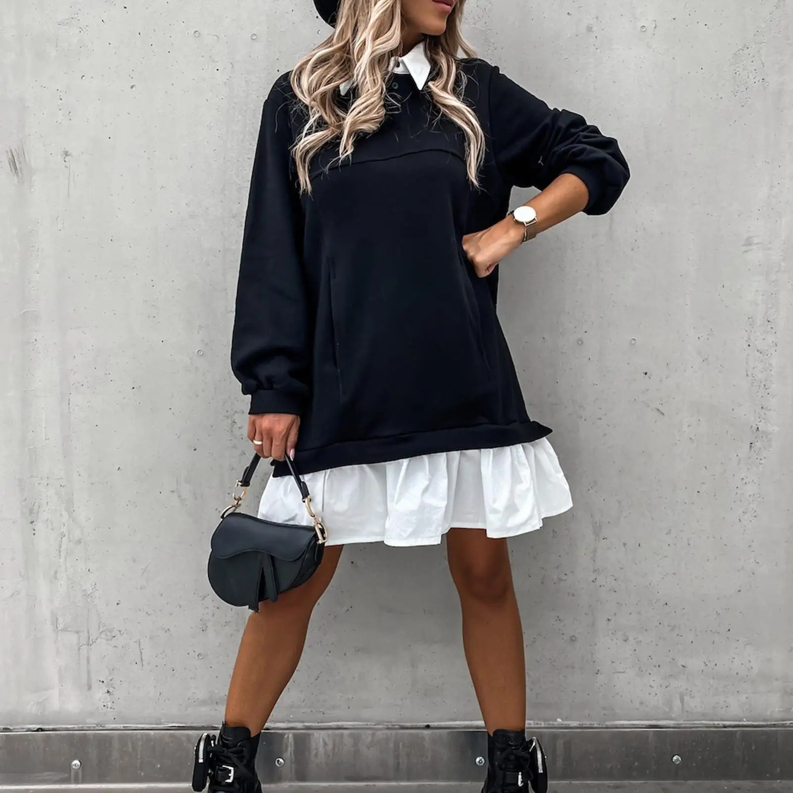 Women Autumn Winter Warm Turn-down Collar Long Sleeve Patchwork Buttons Sweatshirt Dress Casual Vestidos