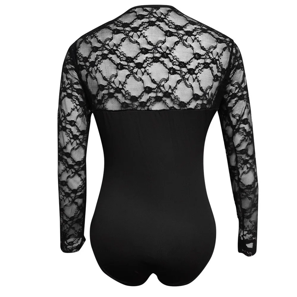 Women Bodysuits Solid Long sleeve lace stitching One Piece Bodysuit Sheer Mesh Leotard O Neck bodi femme dantelle W#