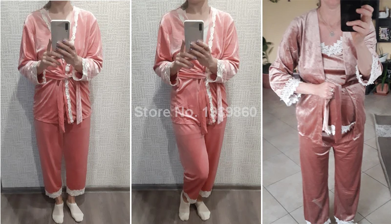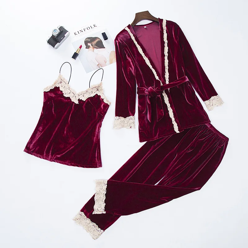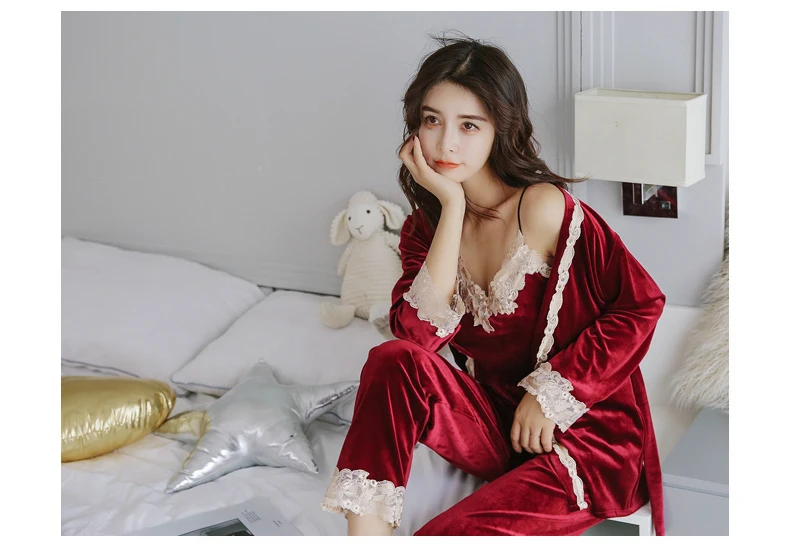 Women New Velvet 3PCS Lace Sleepwear Set Autumn Pajama Suit Sexy Floral Trim Nightwear Bride Wedding Robe Intimate Lingerie
