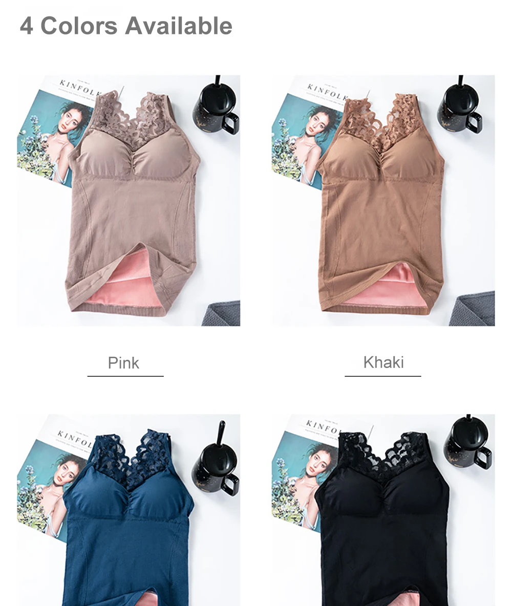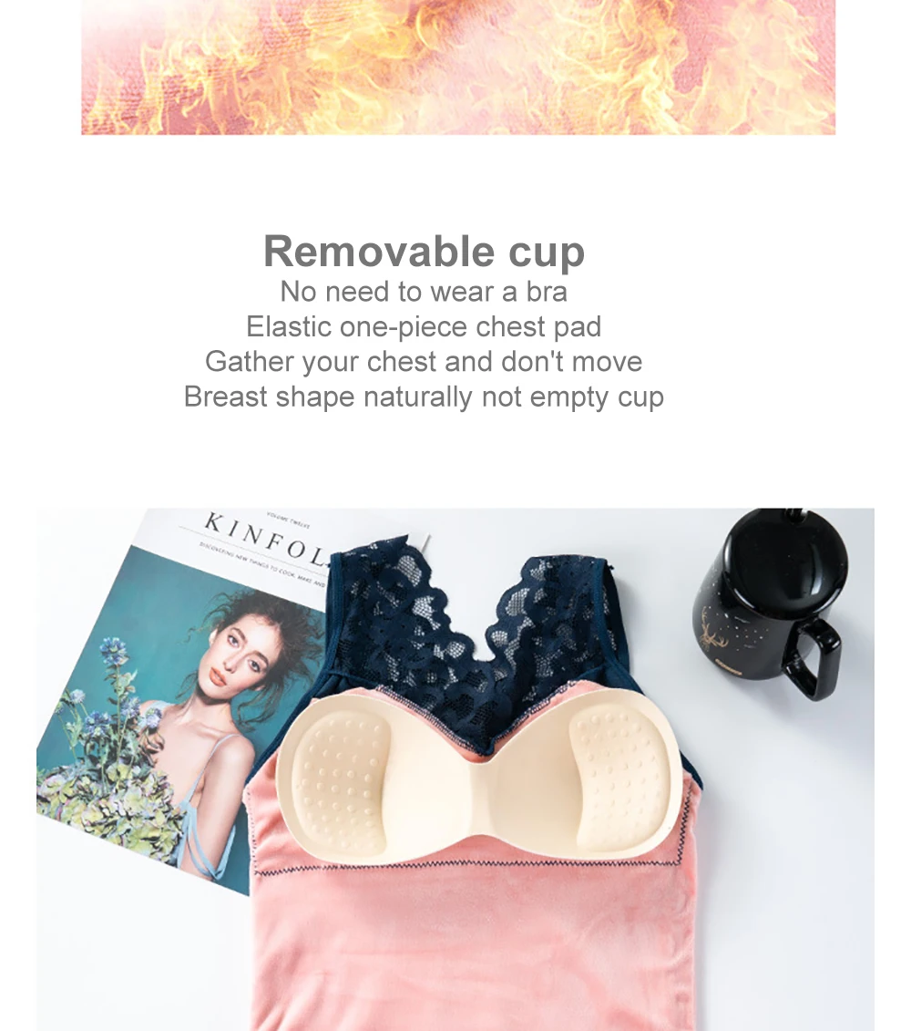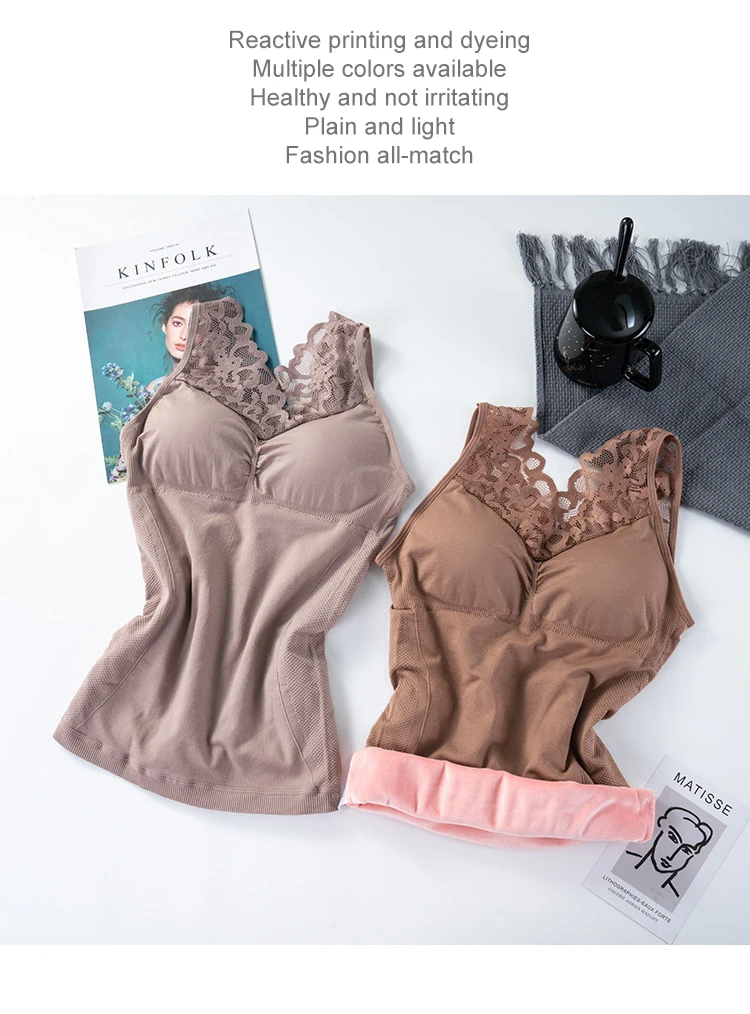 Women Warm Slim Tank Top Plus Velvet Thermal Underwear Sexy Lace V Neck Crop Top Thermo Lingerie With Gathered Padded Bra