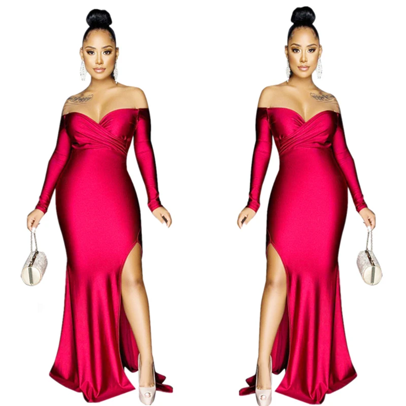 Women’s Full Dress Solid Color Off Shoulder Split Evening Dress L51672