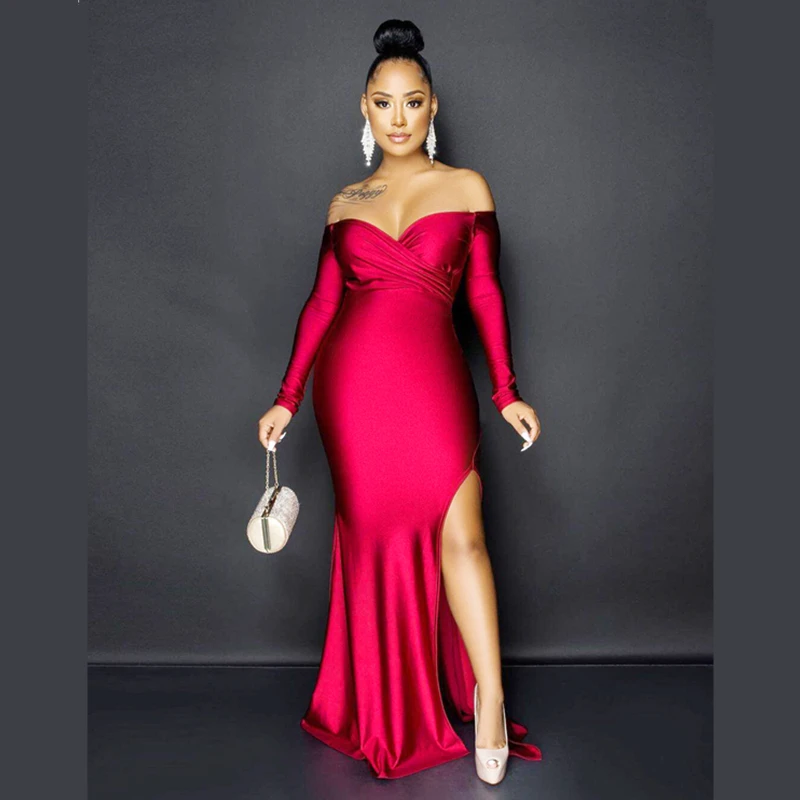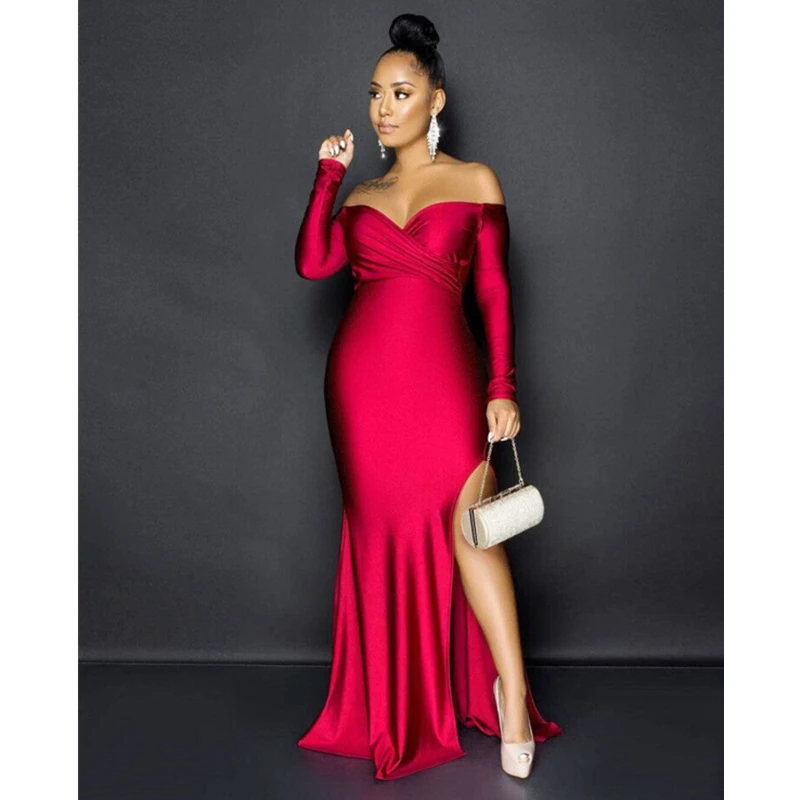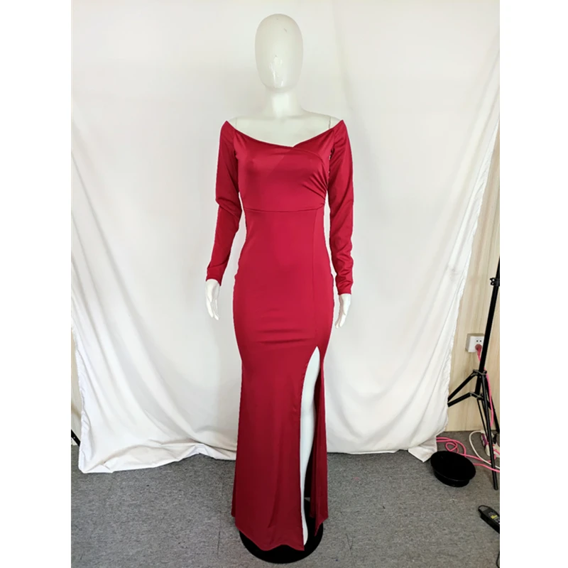 Product Name Solid Color Off Shoulder Split Evening Dress Item NO. L51672 Feature Eco-Friendly, Plus Size Technics Plain Dyed Season Spring, Autumn Material Spandex/Polyester Package Contents 1 x Dress Sleeve Style Off the Shoulder Dresses Length Ankle-Length Sleeve Length(cm) Long Sleeve Neckline Style Slash Neck Weight 0.53 kg = 1.1684…