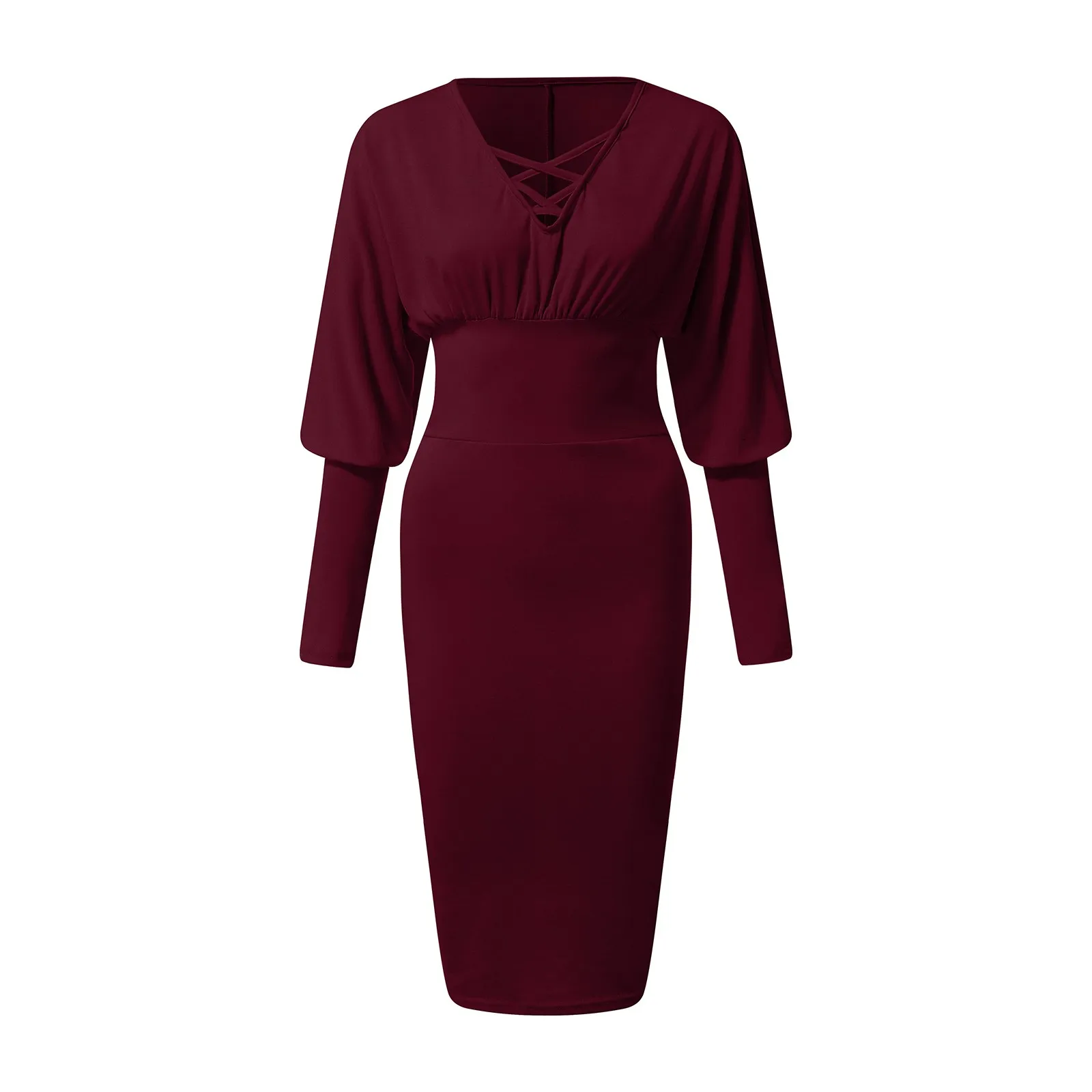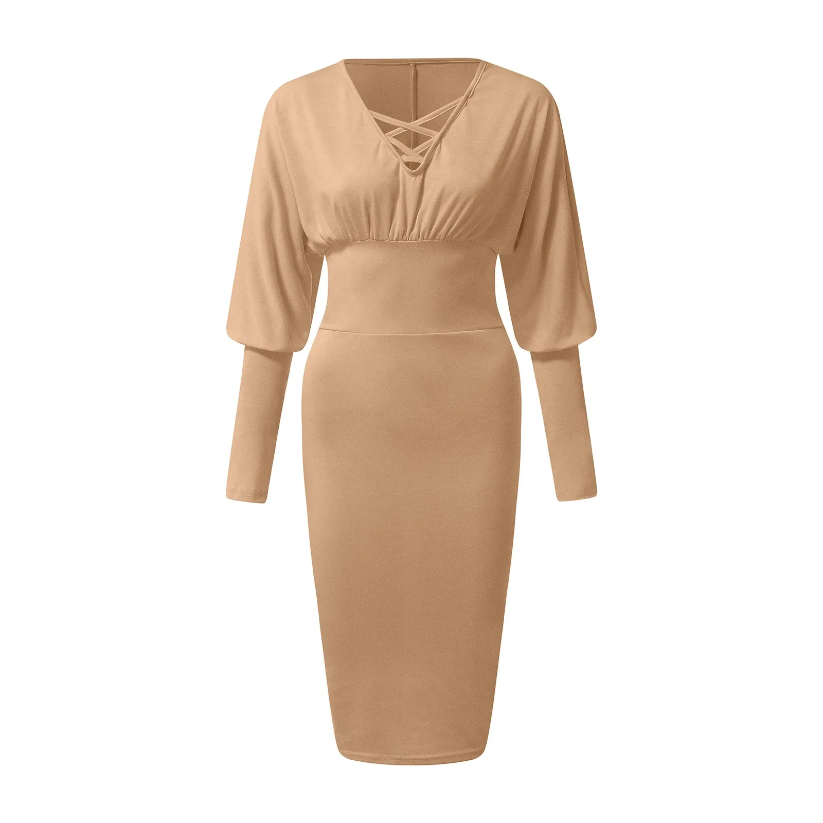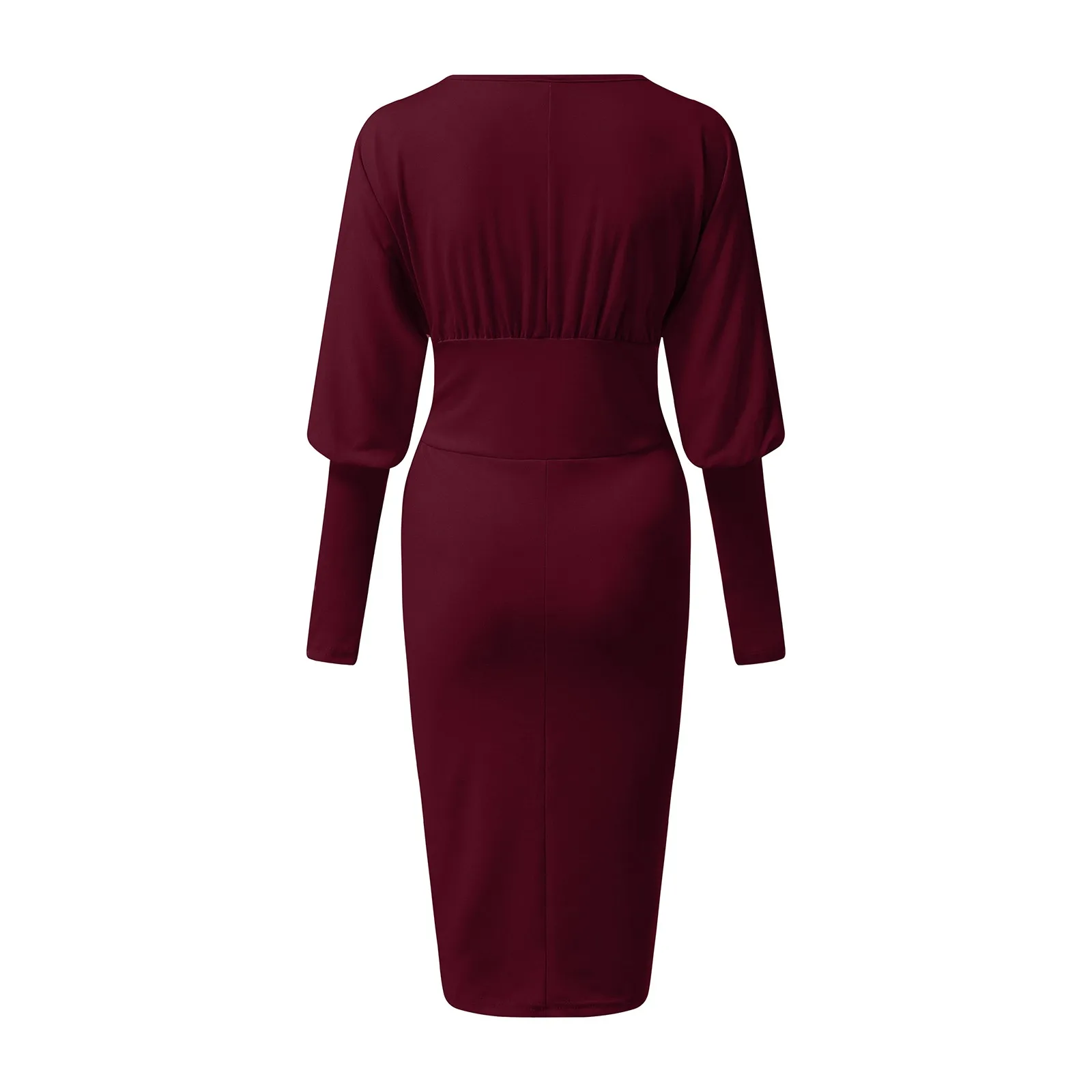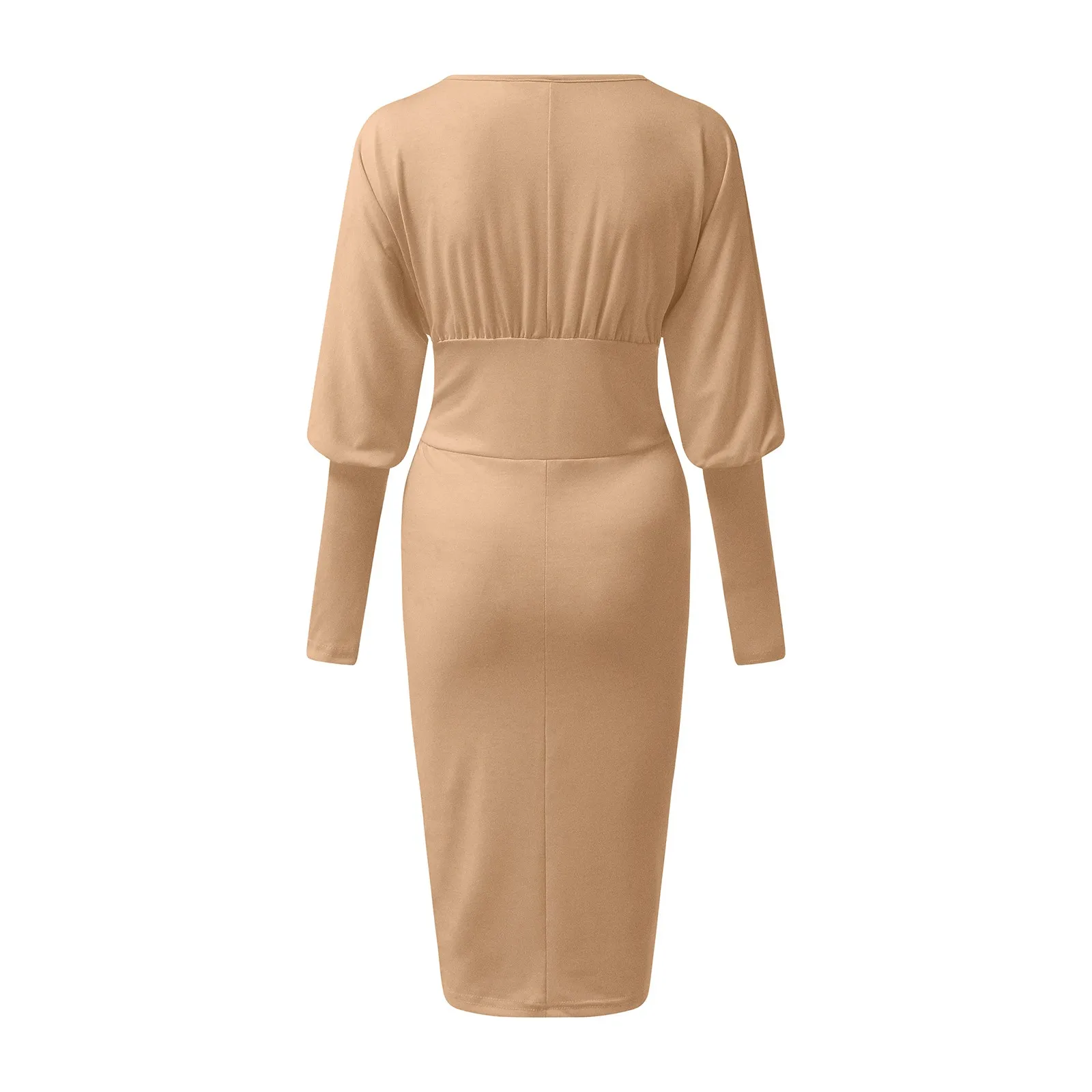 Women Sexy Deep V-Neck Drawstring Pleated Hip Skirt Long Sleeve Tight Dress