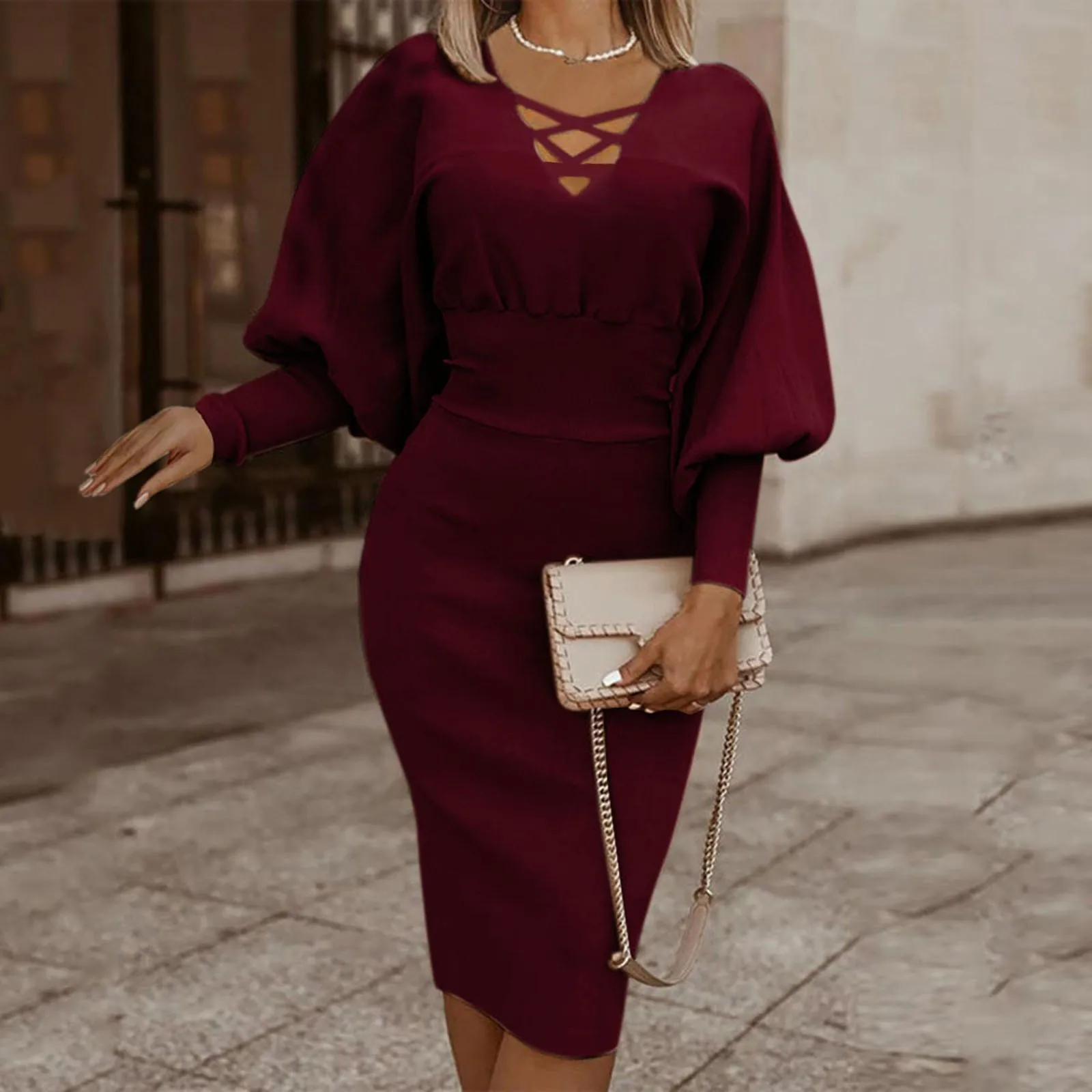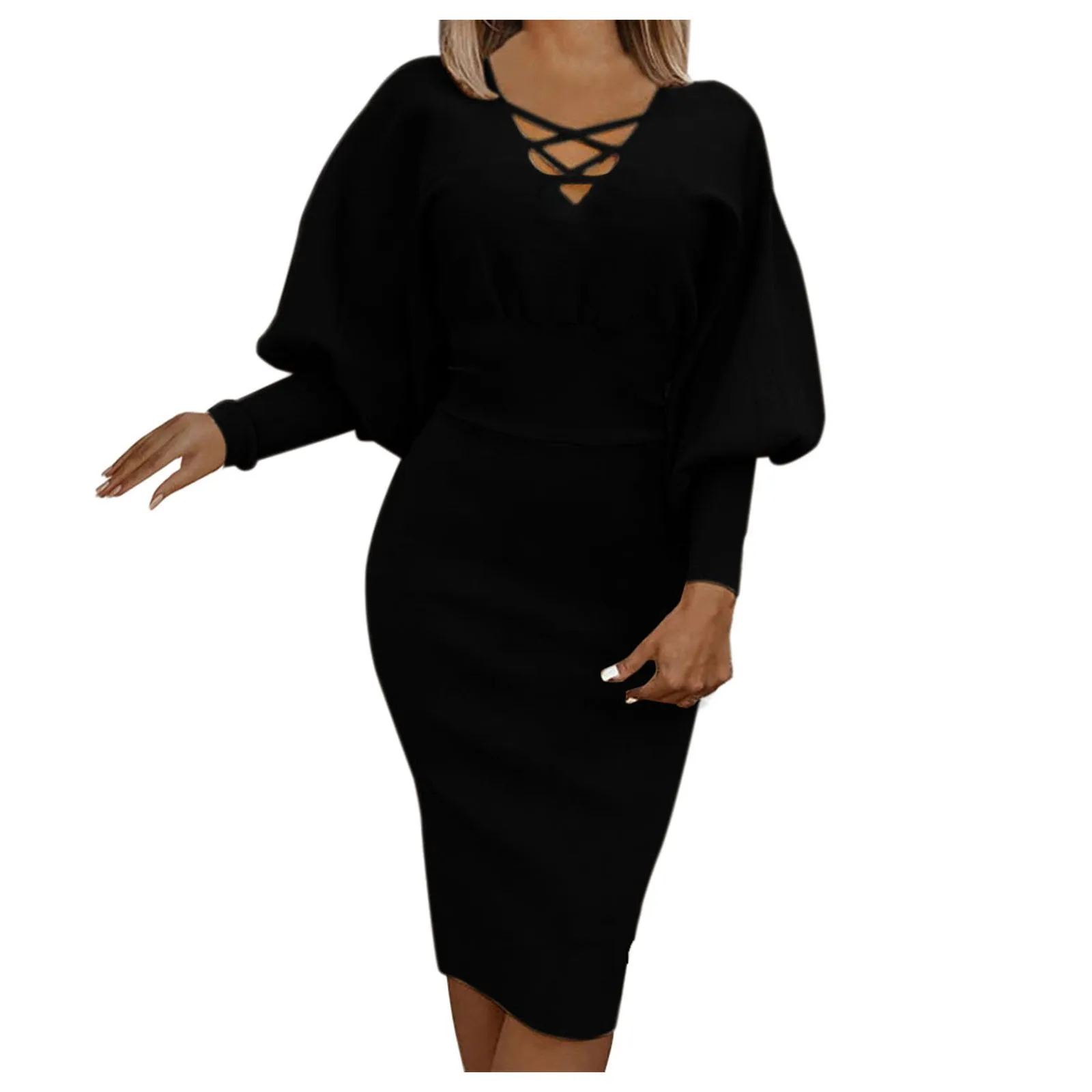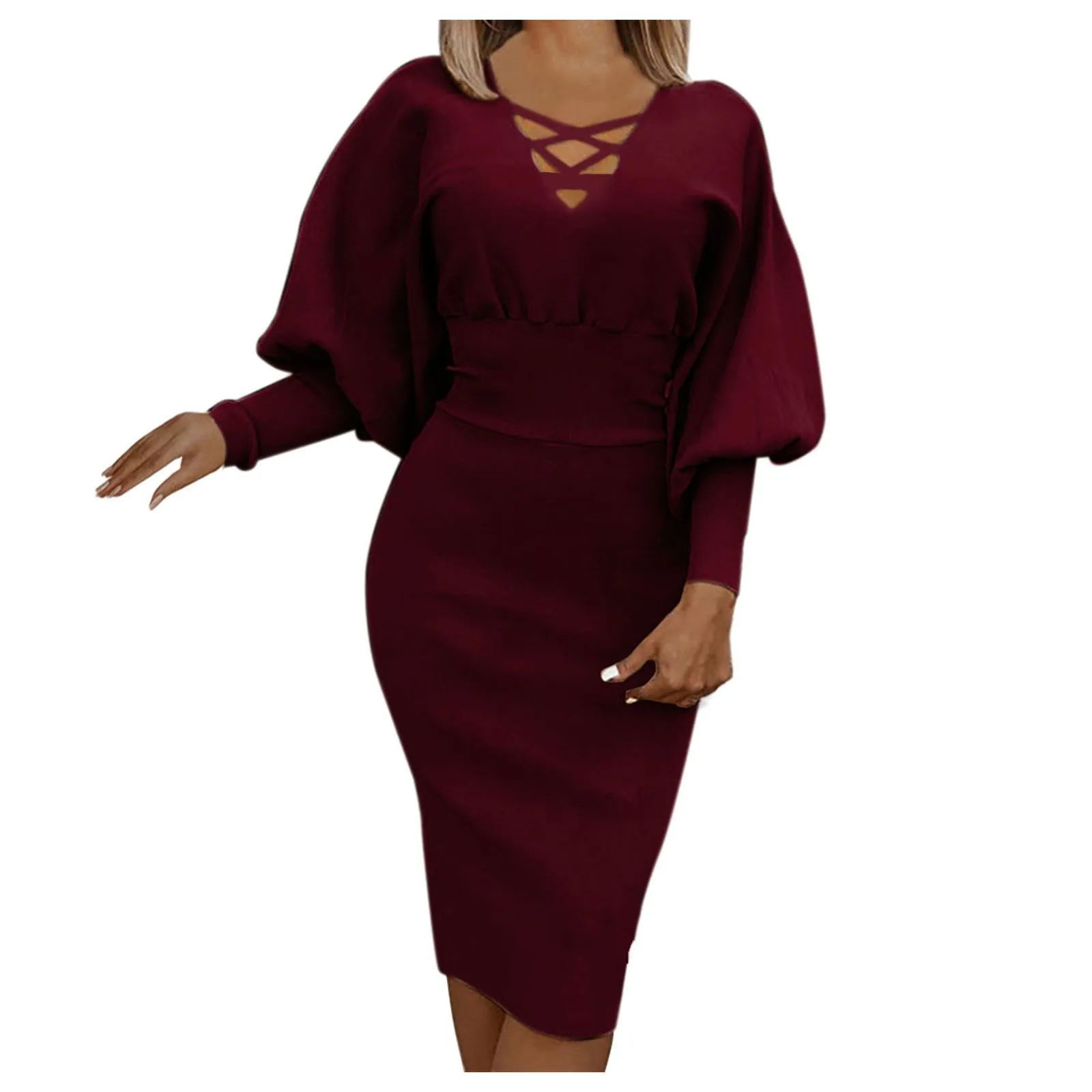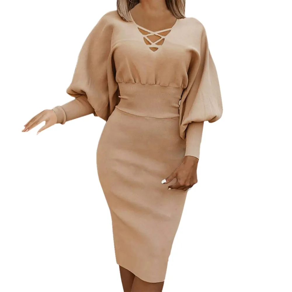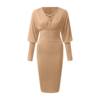 Women’s Sweater Dress Jumper Female Clothing Sexy Wrap Ribbed Bodycon Dresses Winter Warm Slim V Neck Knitted Pullover Dress#40