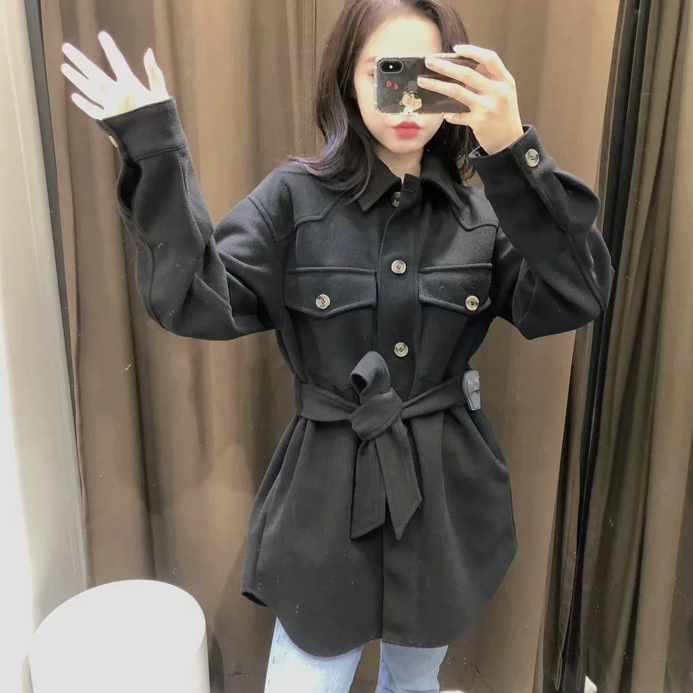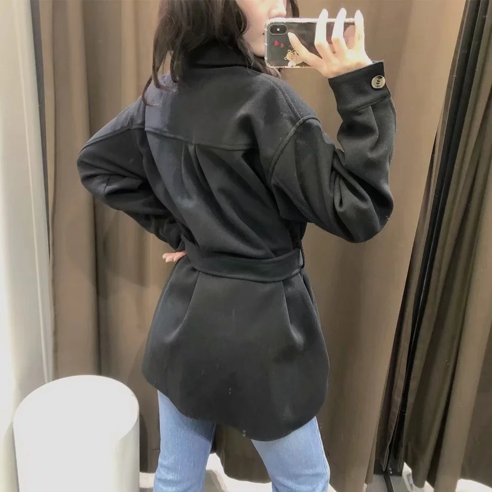 XNWMNZ Za Women 2020 Fashion With Belt Loose Woolen Jacket Coat Vintage Long Sleeve Side Pockets Female Outerwear Chic Overcoat