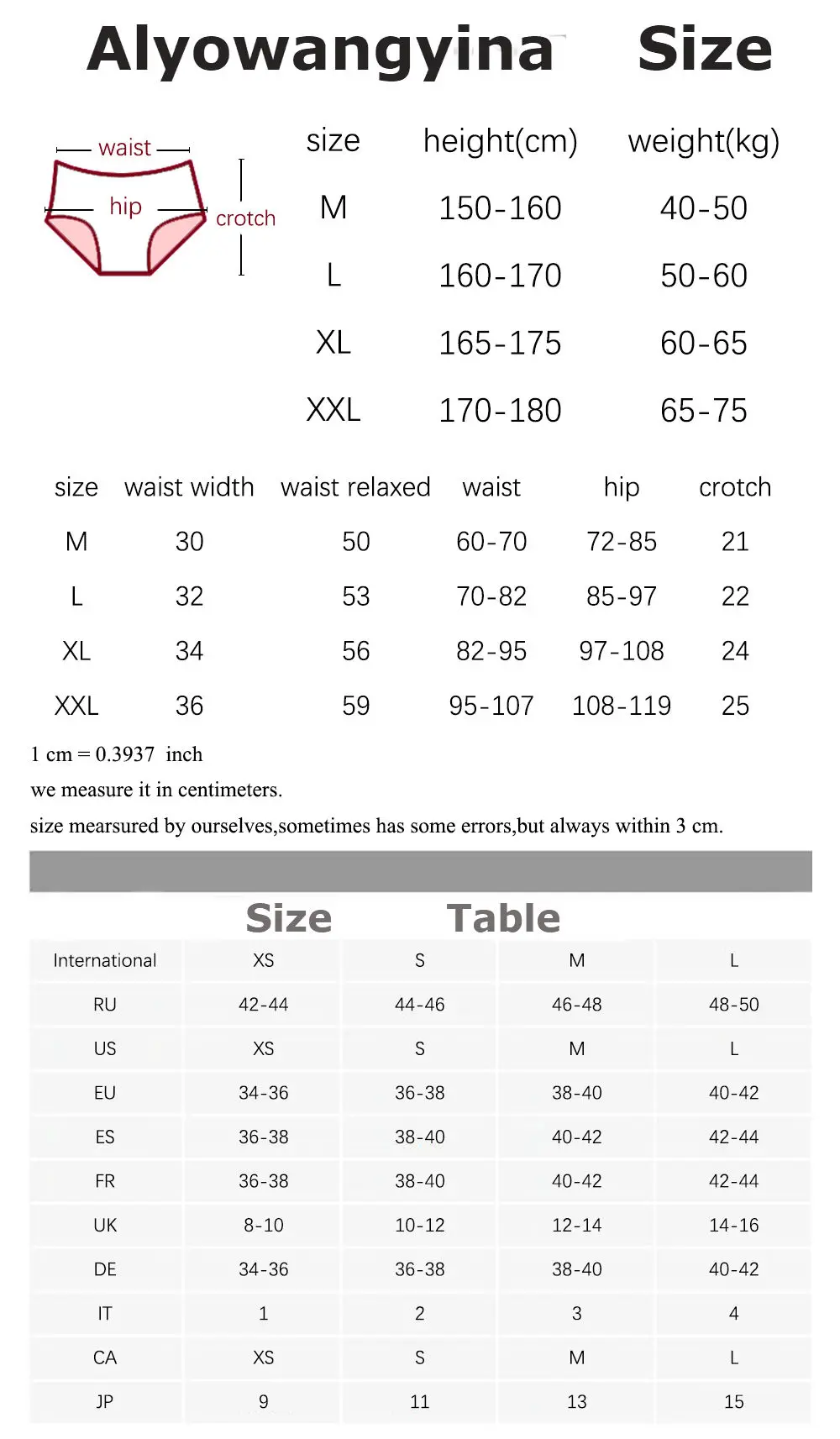 70724 Fashion Women Underwears —————————————————Brand Name————————————————————- Alyowangyina M Waist: 31cm, suit for waistline 62-76 cm(24.4-30 inch), for hip 74-88cm (29.1-34.6 inch); S uitable weight: 45-55kg; L Waist: 33cm, suit for waistline 76-90cm(30-35.4 inch), for hip 88-102cm (34.6-40.1 inch); S uitable weight: 55-65kg; XL Waist: 35cm, suit for waistline 85-98cm(33.4-38.5 inch),…