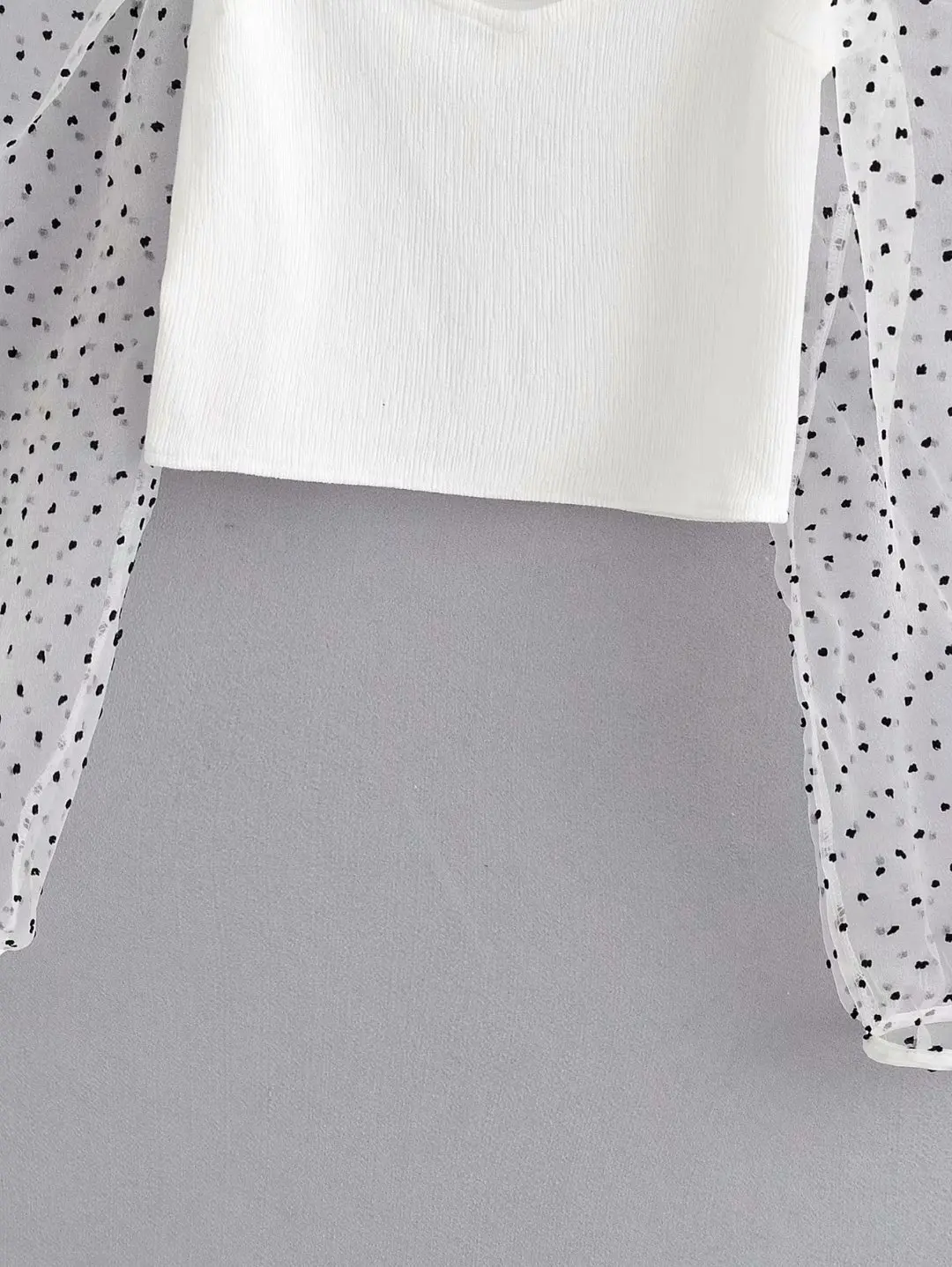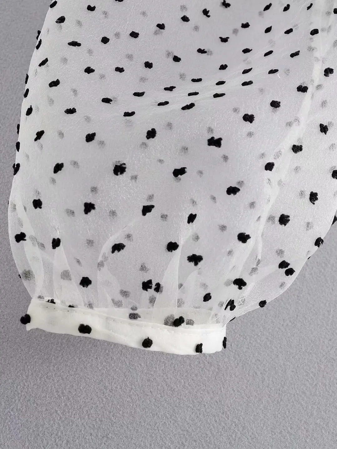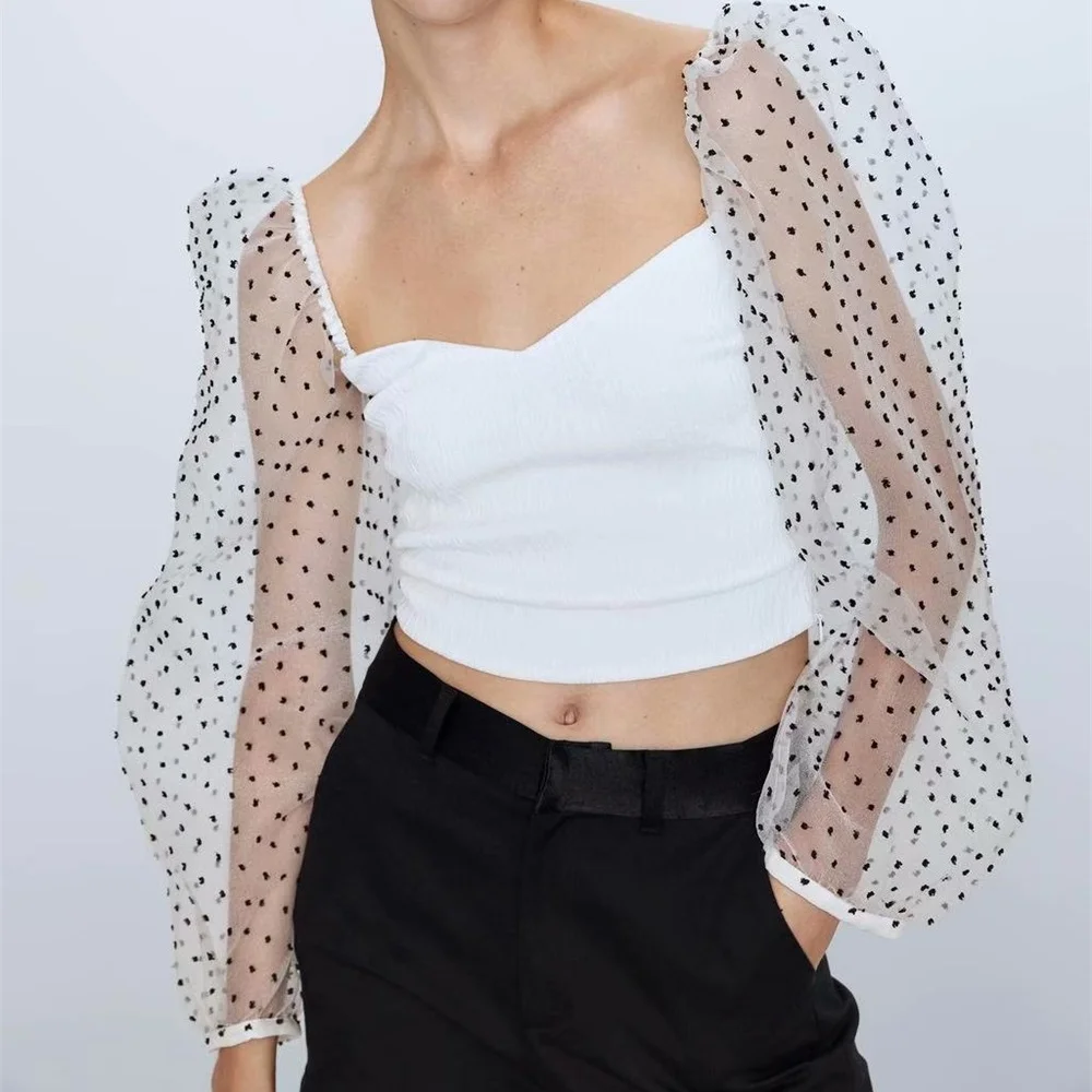 Za women’s new V-neck puffy long sleeve transparent hard yarn splicing top wave dot printed Tulle top in autumn 2019