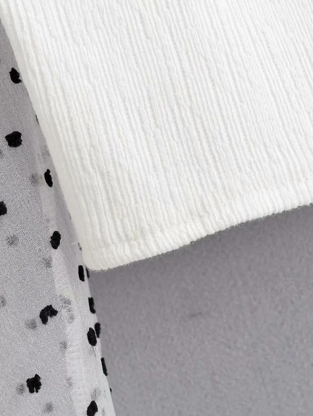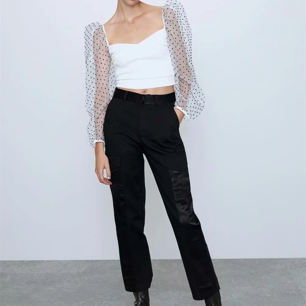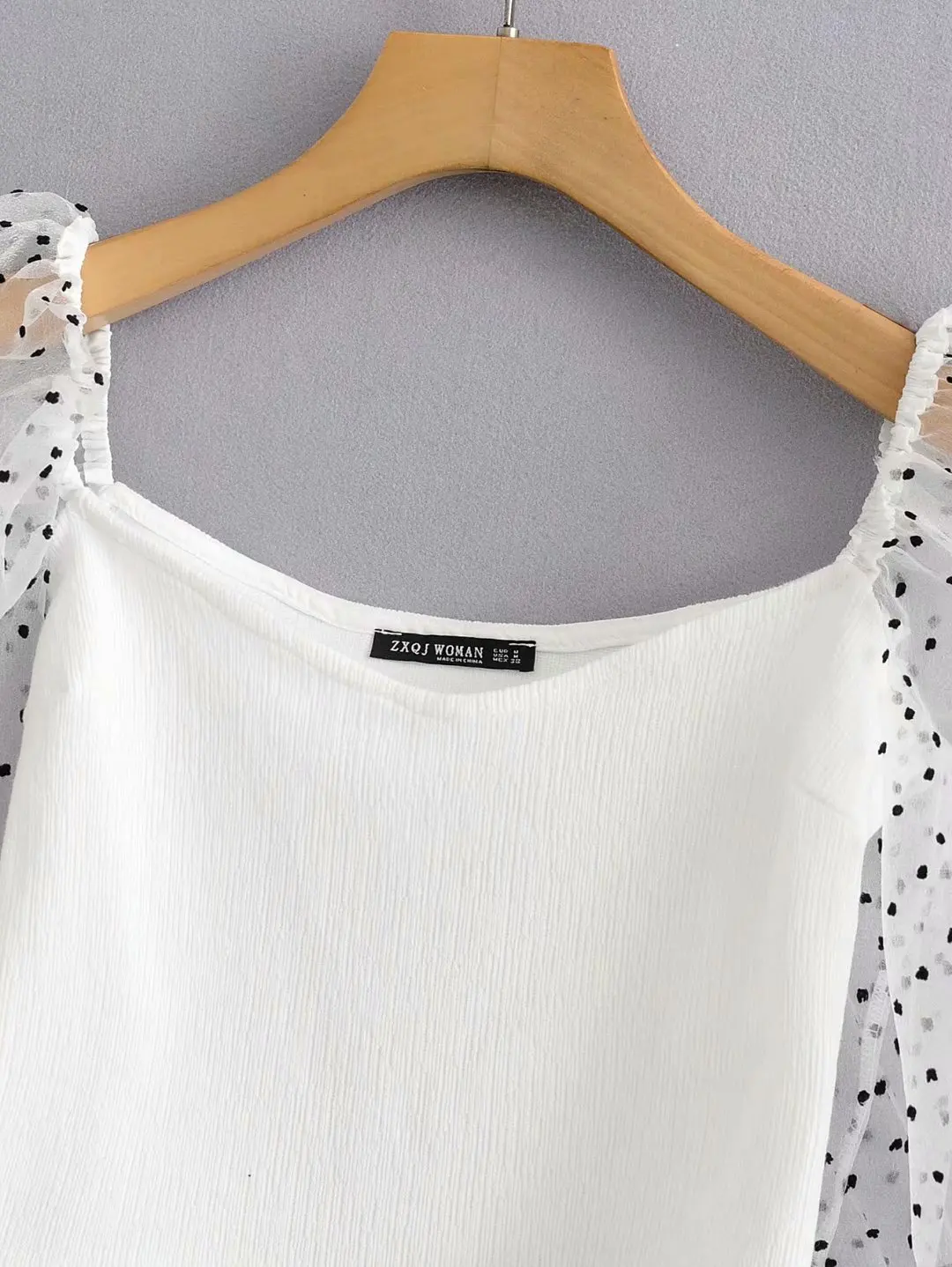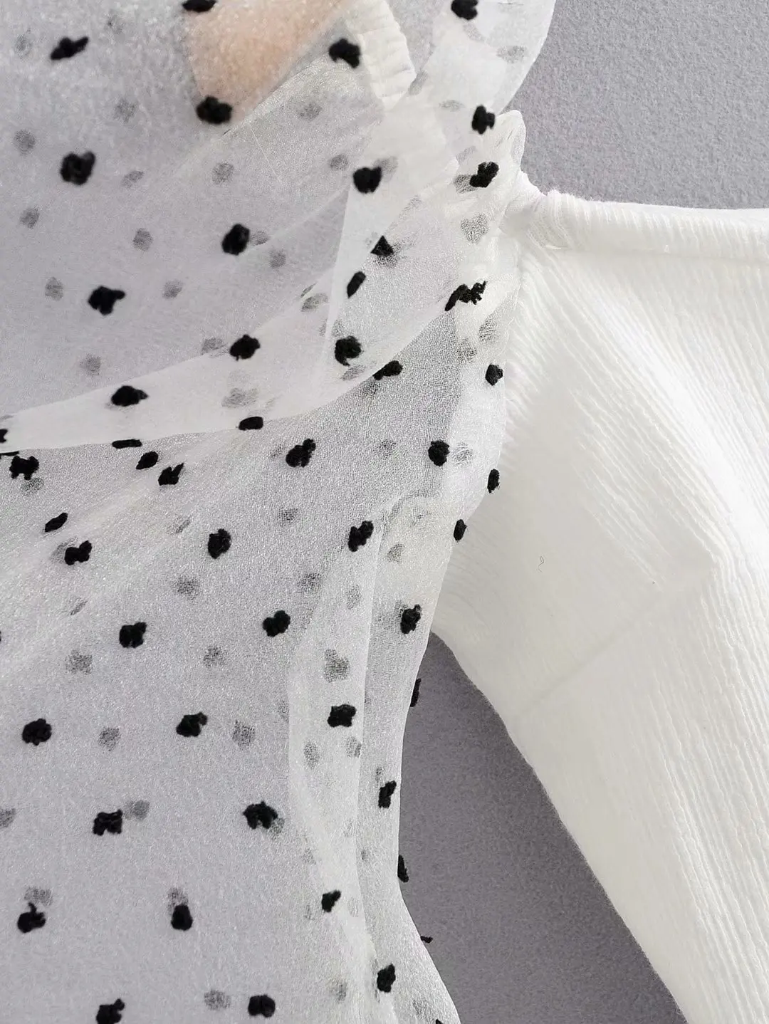 Za women’s new V-neck puffy long sleeve transparent hard yarn splicing top wave dot printed Tulle top in autumn 2019